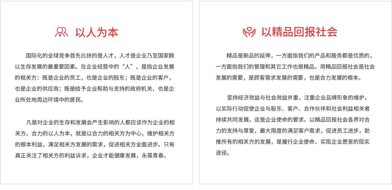 十大準則”既是合力過去50多年的成功之道,更是合力實現未來戰略,全體合力人必須大力弘揚的理念、原則和方法,必須共同遵守的行為準核心價值觀:『以人為本,以精品回報社會』